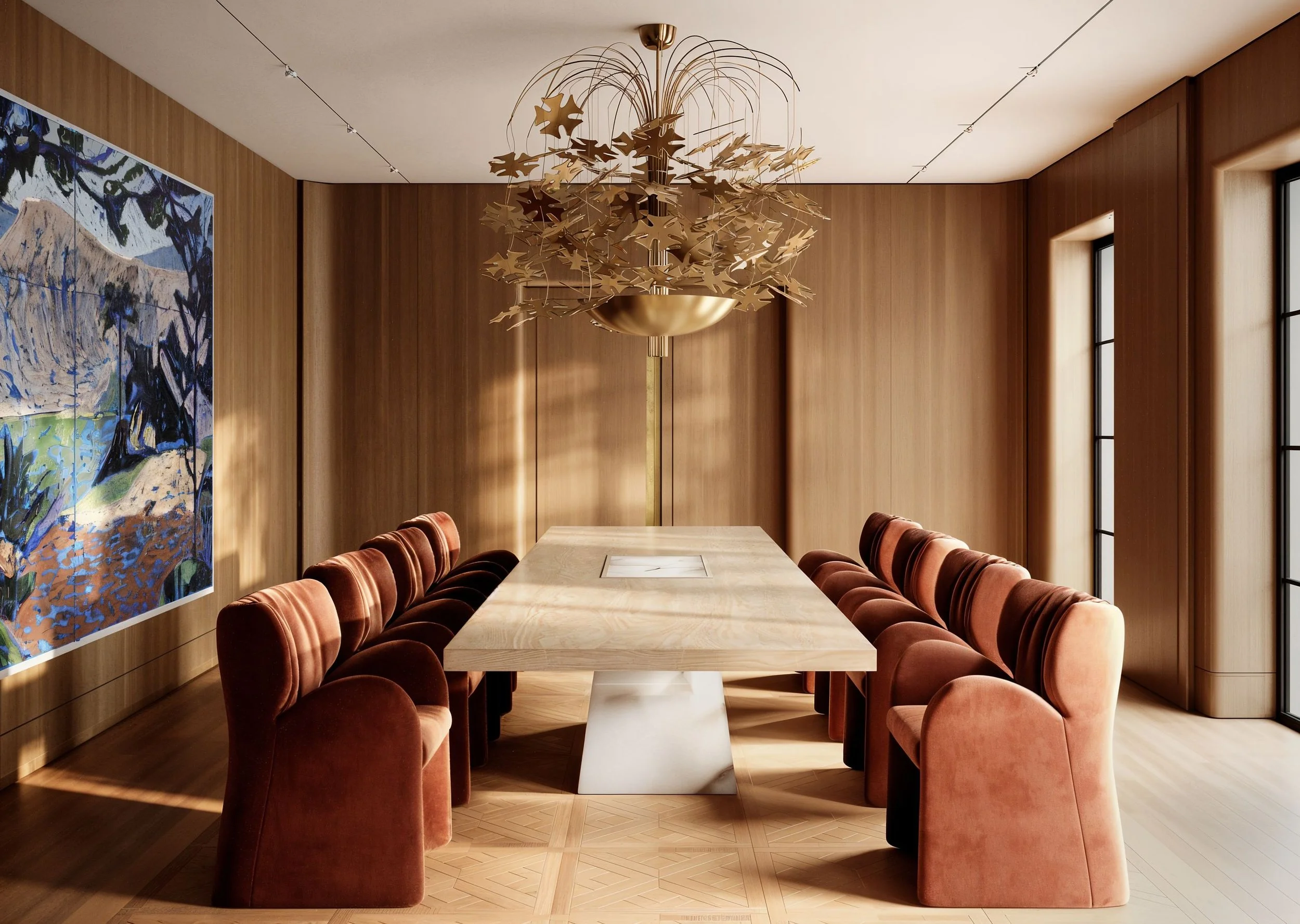 Az étkező merész, mégis stabil karakterű: a rozsdaszínű bársonyszékek és a nagy méretű műalkotások személyiséget adnak a tiszta vonalaknak. Ezzel szemben a háló- és nappali terek letisztultabbak, lágyak, rétegzettek és szándékosan egyszerűek.